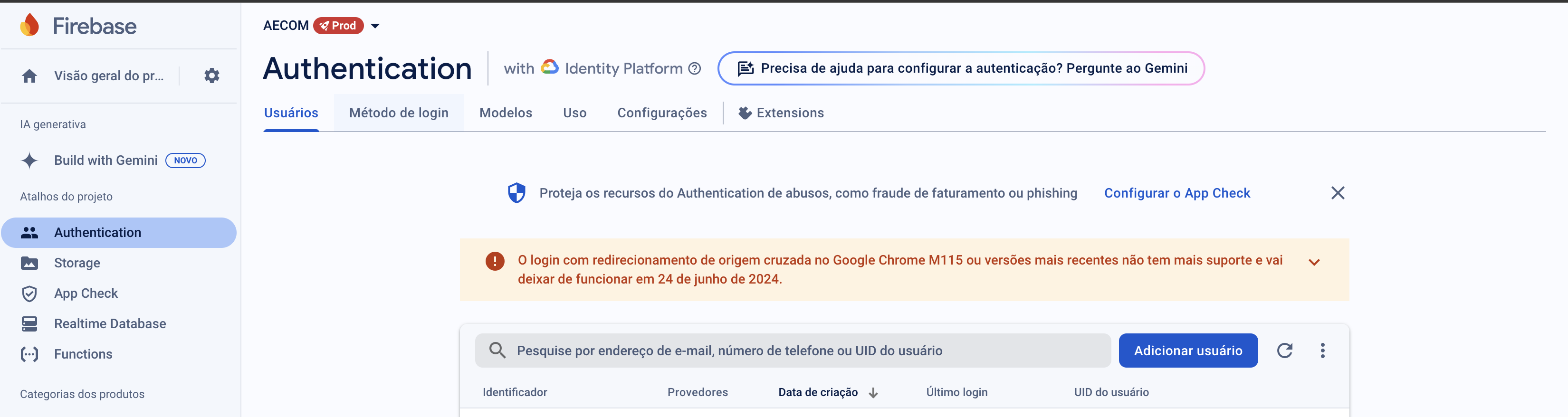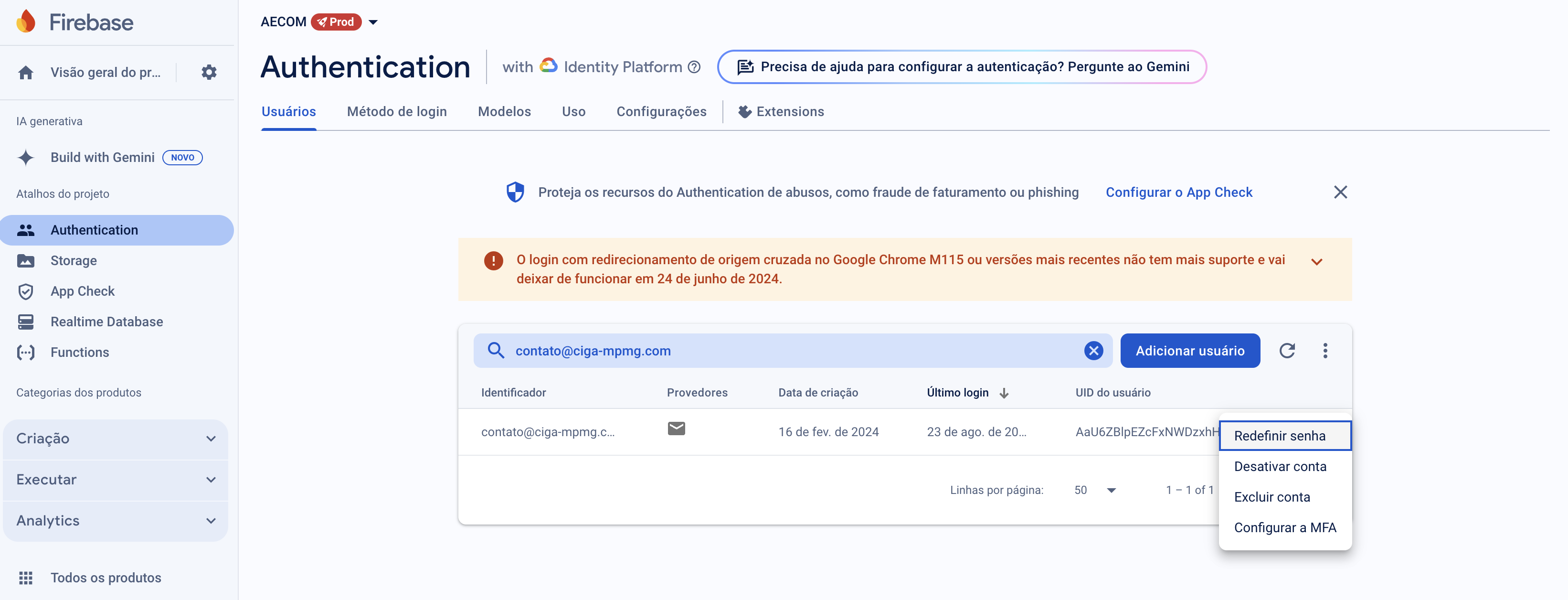 O administrador do sistema CIGA pode cadastrar novos usuários interagindo com o painel de gerenciamento do Firebase: